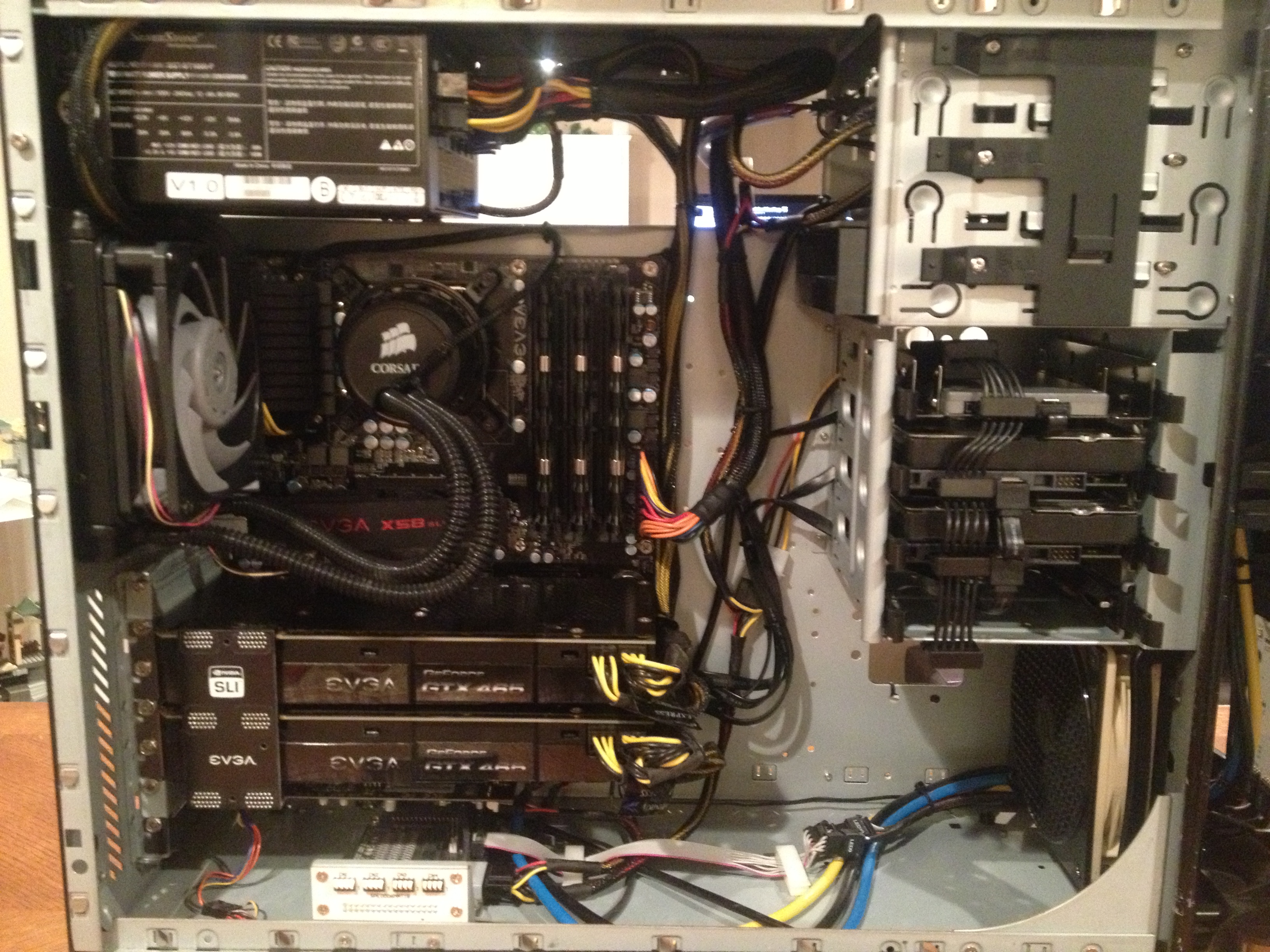 This was also the prime era of overclocking. The i7 CPU shipped at a slow 2.66GHz, but with some good cooling (and tons of power) provided by the Corsair H50 I could overclock it all the way up to 4.2ghz. Both GPU’s also left huge amounts of headroom on the table, I used MSI Afterburner to get significant performance increases from them as well. Of course, this only contributed to the heat output and power usage, at the time GPUs and CPUs did not downclock when underutilized, we are talking full power and full clocks, full time. It is crazy now to think this just ran full speed all the time even when just reading the web.